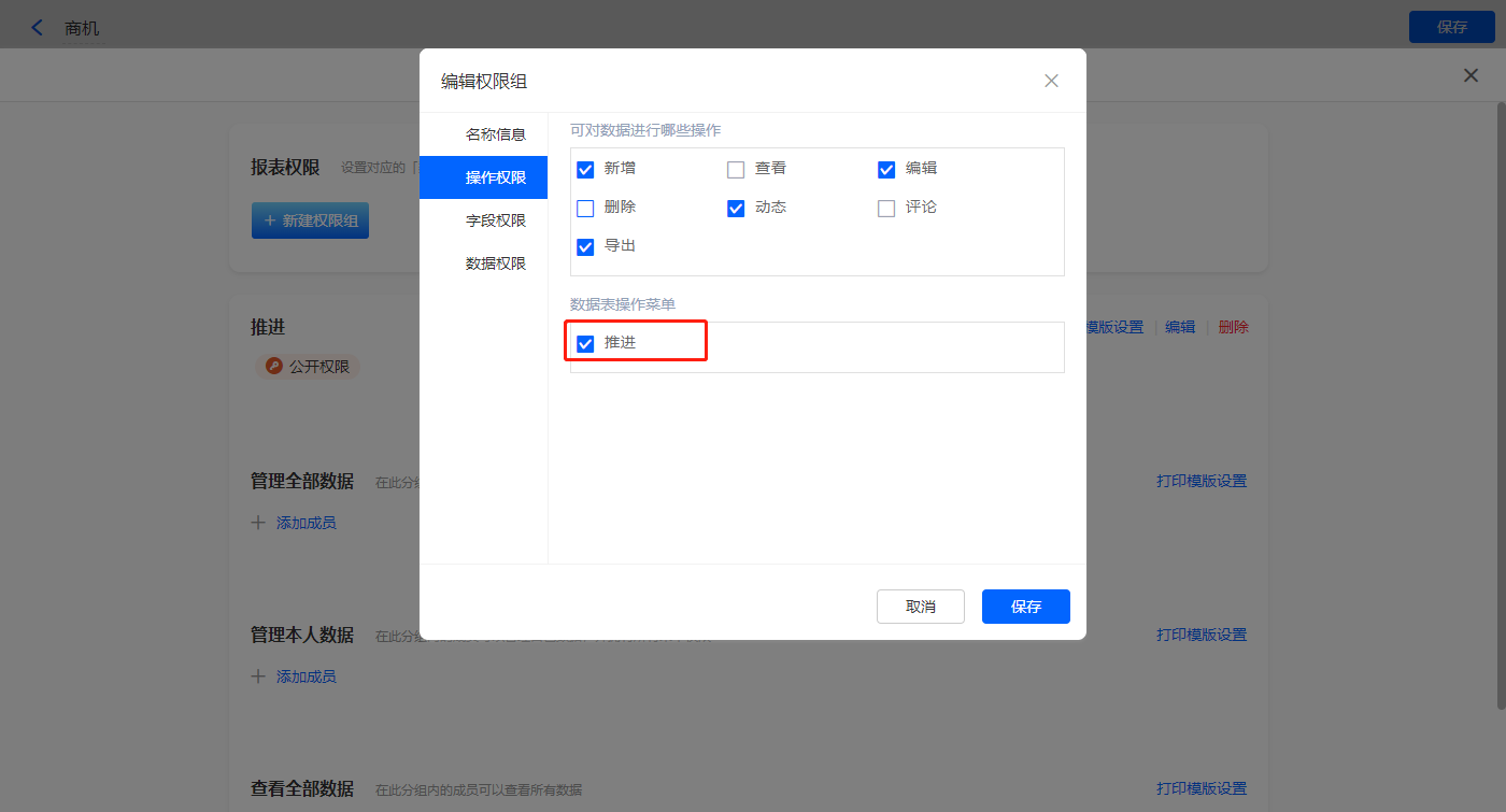 2)新增数据表菜单栏【推进】;