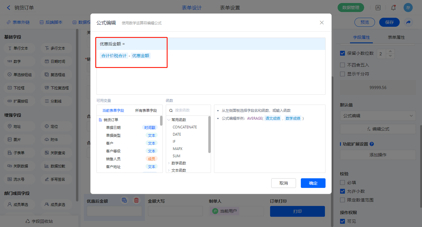 1)【合计金额】字段默认值设置为公式编辑,如图设置公式;