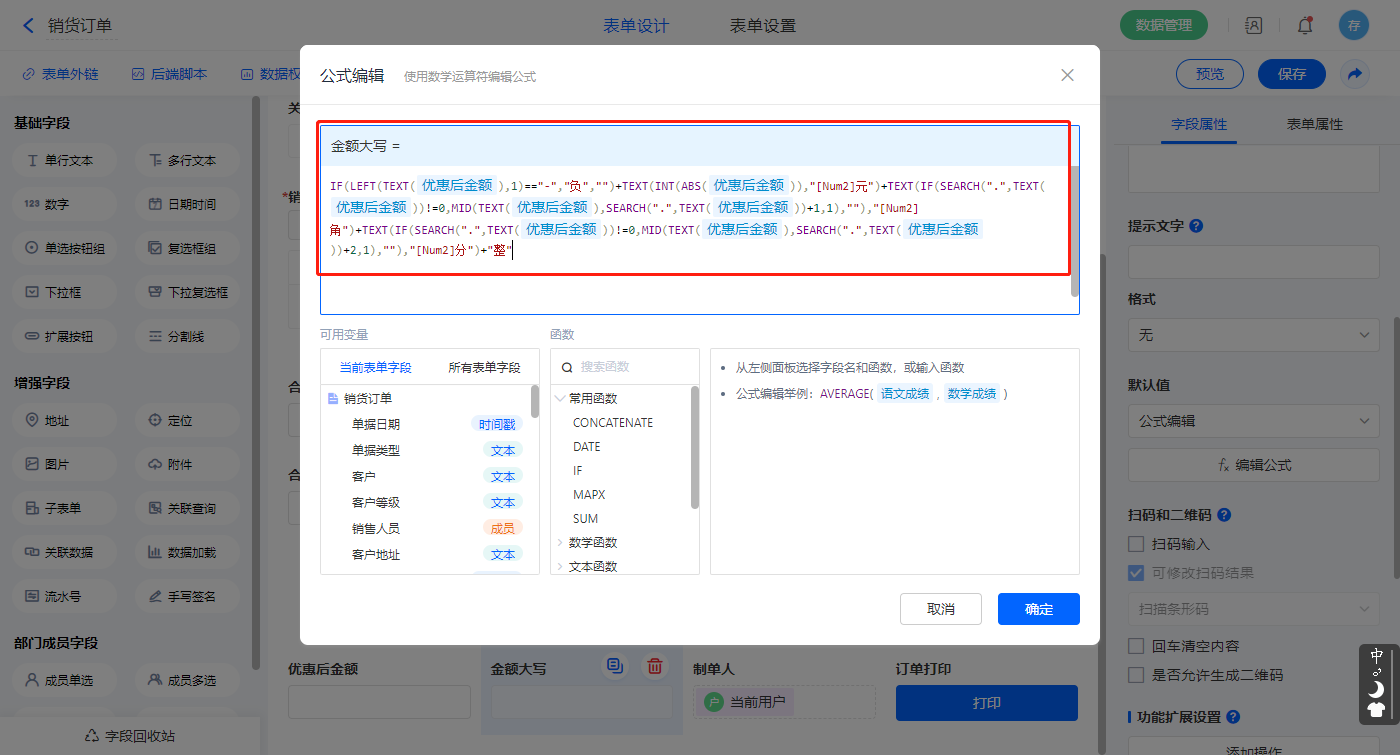 【收款金额】字段默认值设置为公式编辑,如图设置公式;