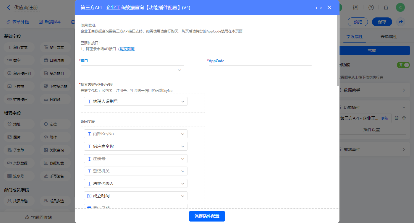 4)扩展按钮【企业工商数据查询】,模式选择扩展功能,设置【校第三方API-企业工商数据查询】的功能插件,配置好校验条件等配置;