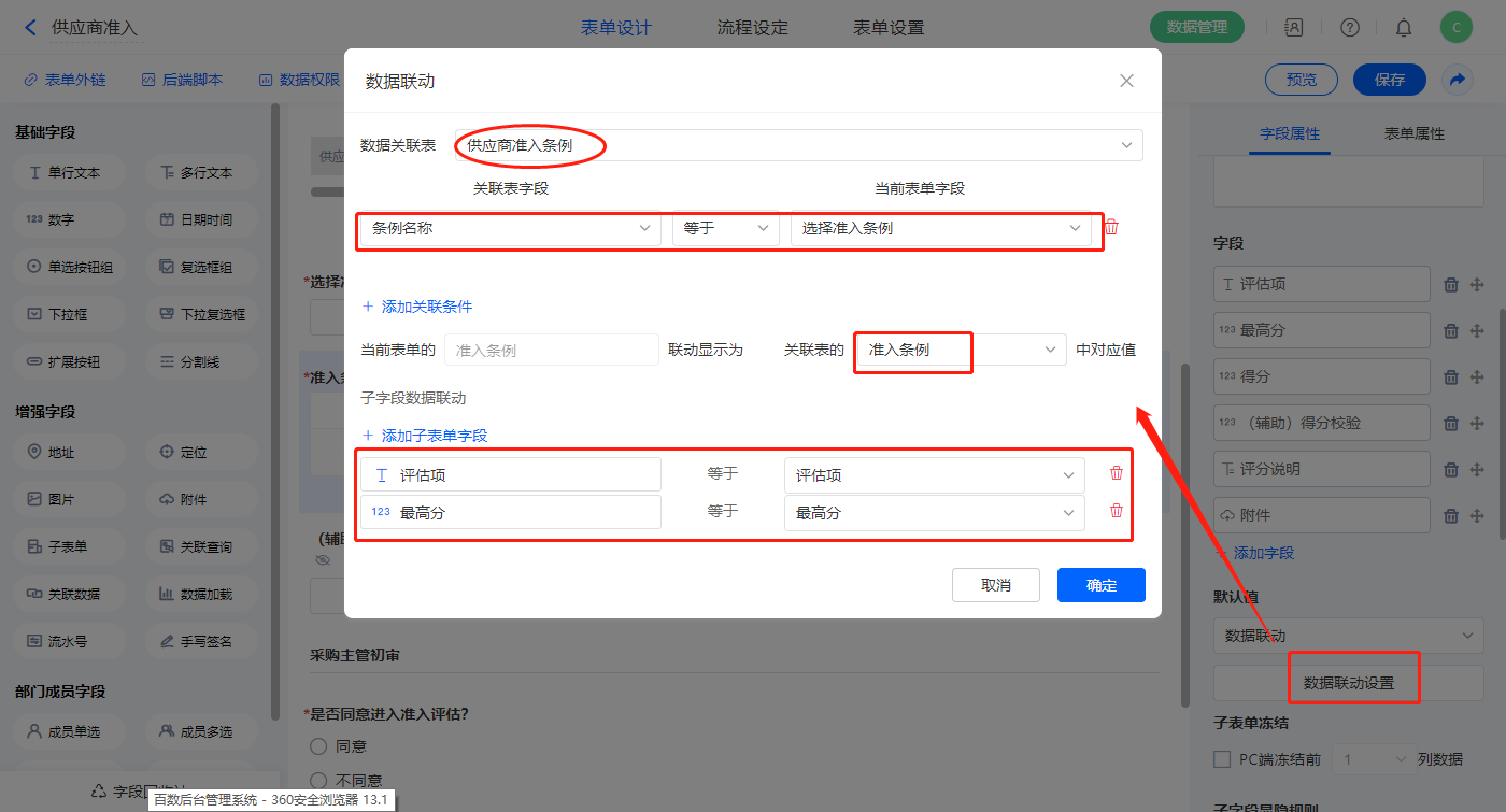 【准入条例】子表单字段,设置默认值为数据联动,设置联动条件及联动字段;