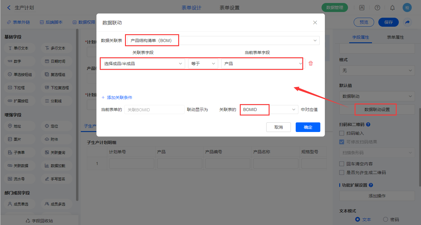 【关联BOMID】、【是否有下级生产计划】字段设置默认值为数据联动,关联表及关联条件相同,设置对应的联动字段即可;