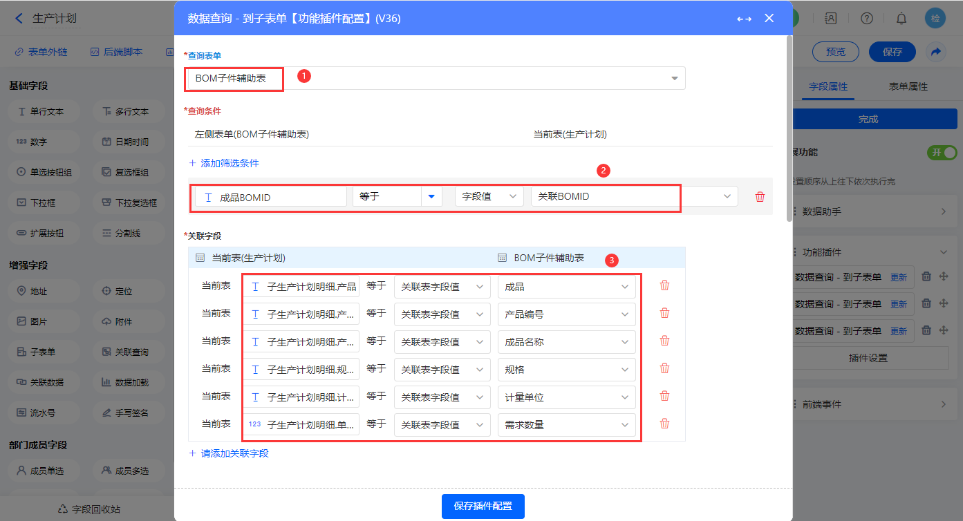 设置三个【数据查询 - 到子表单】功能插件,如图配置;第一个配置【子生产计划明细】子表单;