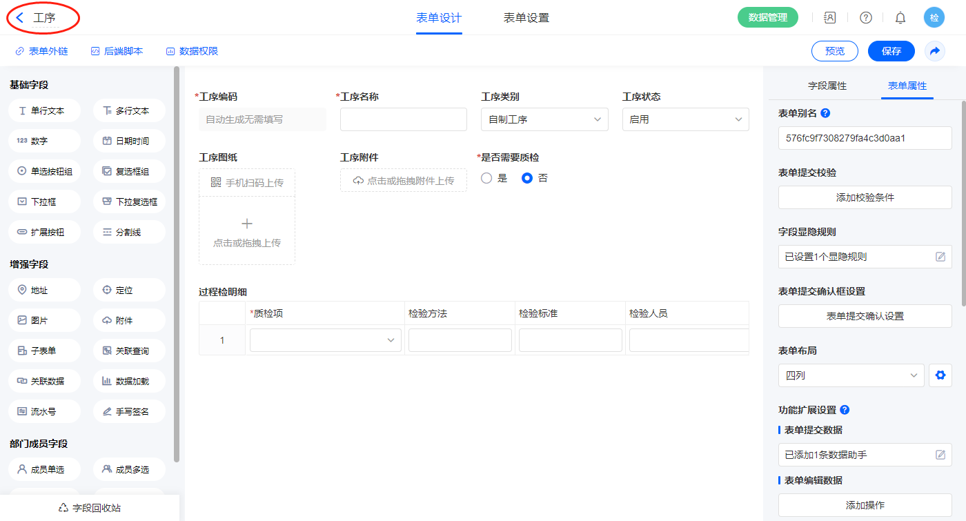 2.2、表单【工序】字段及表单属性设置
