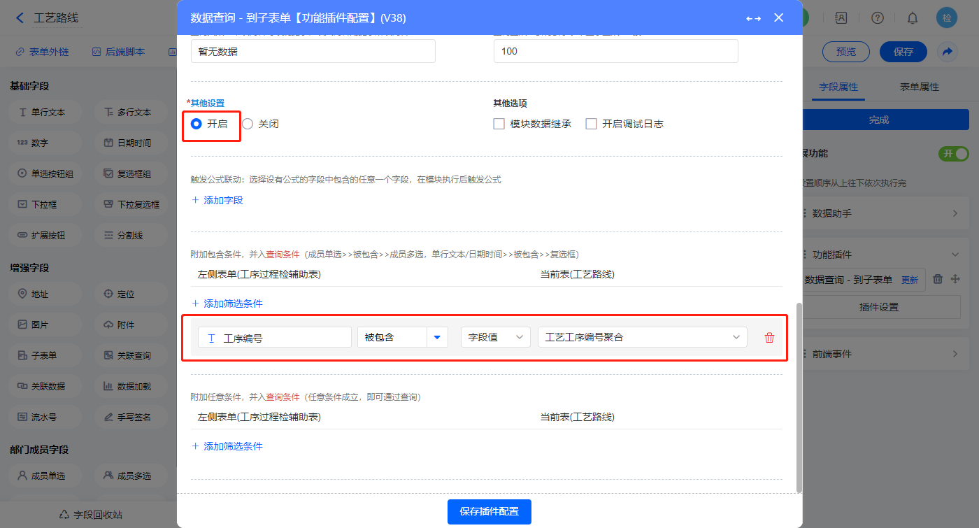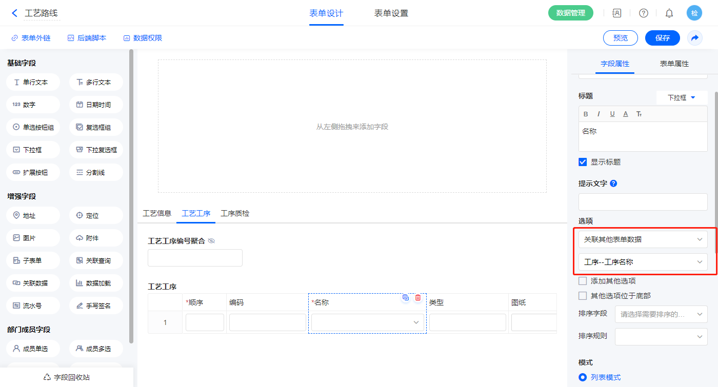 2)【工艺工序.名称】字段,选择设置为关联其他表单数据,关联工序的【工序名称】字段;