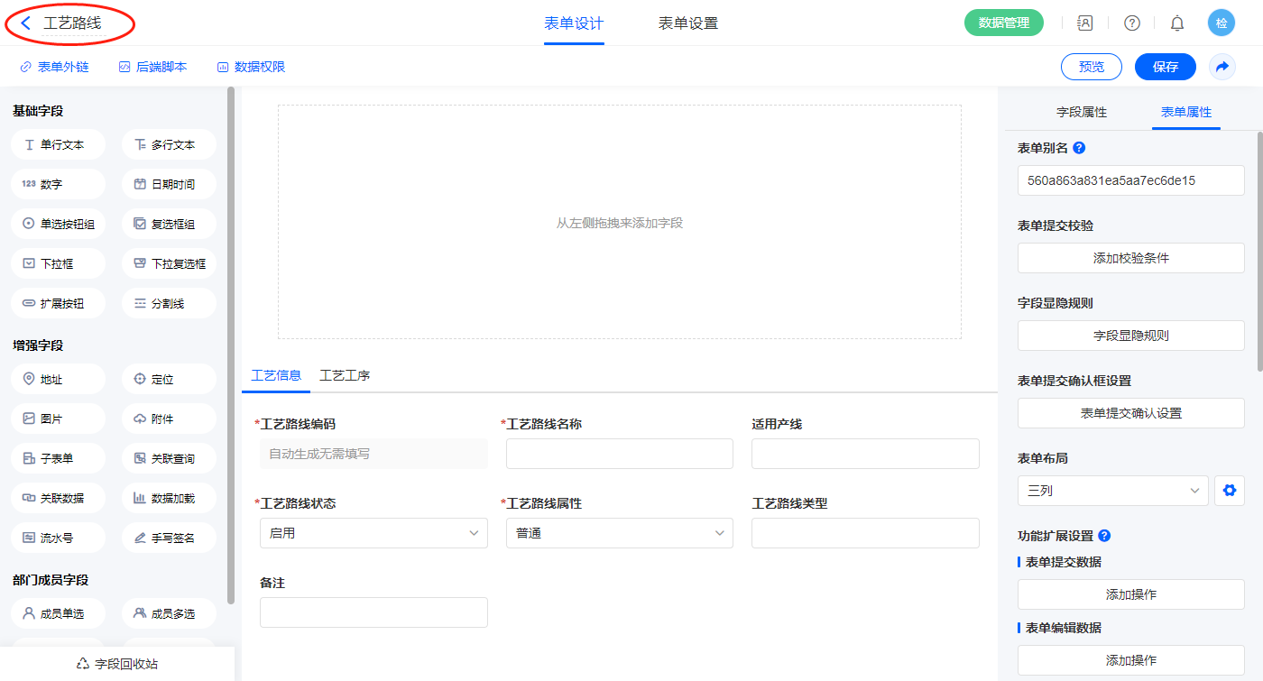 | 工艺路线名称 | 单行文本 | 工艺工序 | 子表单 |