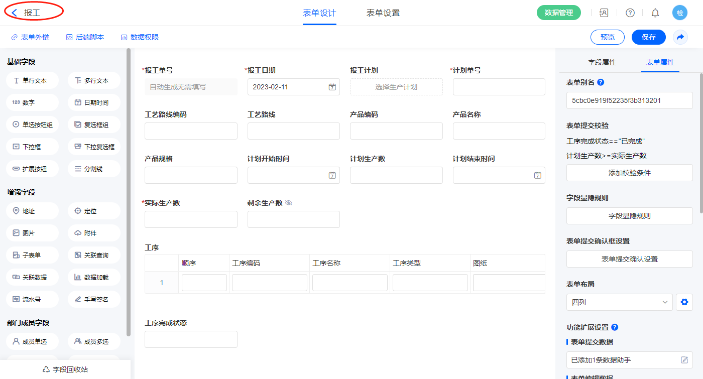 【报工】菜单栏,操作模式设置为弹出表单【报工】;
