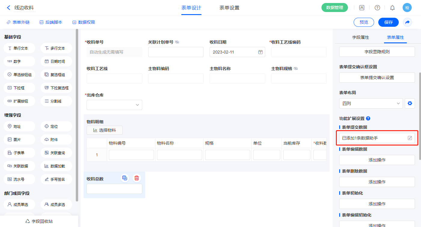 1)【物料明细】子表单开启数据加载,数据源为【物料信息】,添加显示字段设置赋值字段及筛选条件,点击保存;