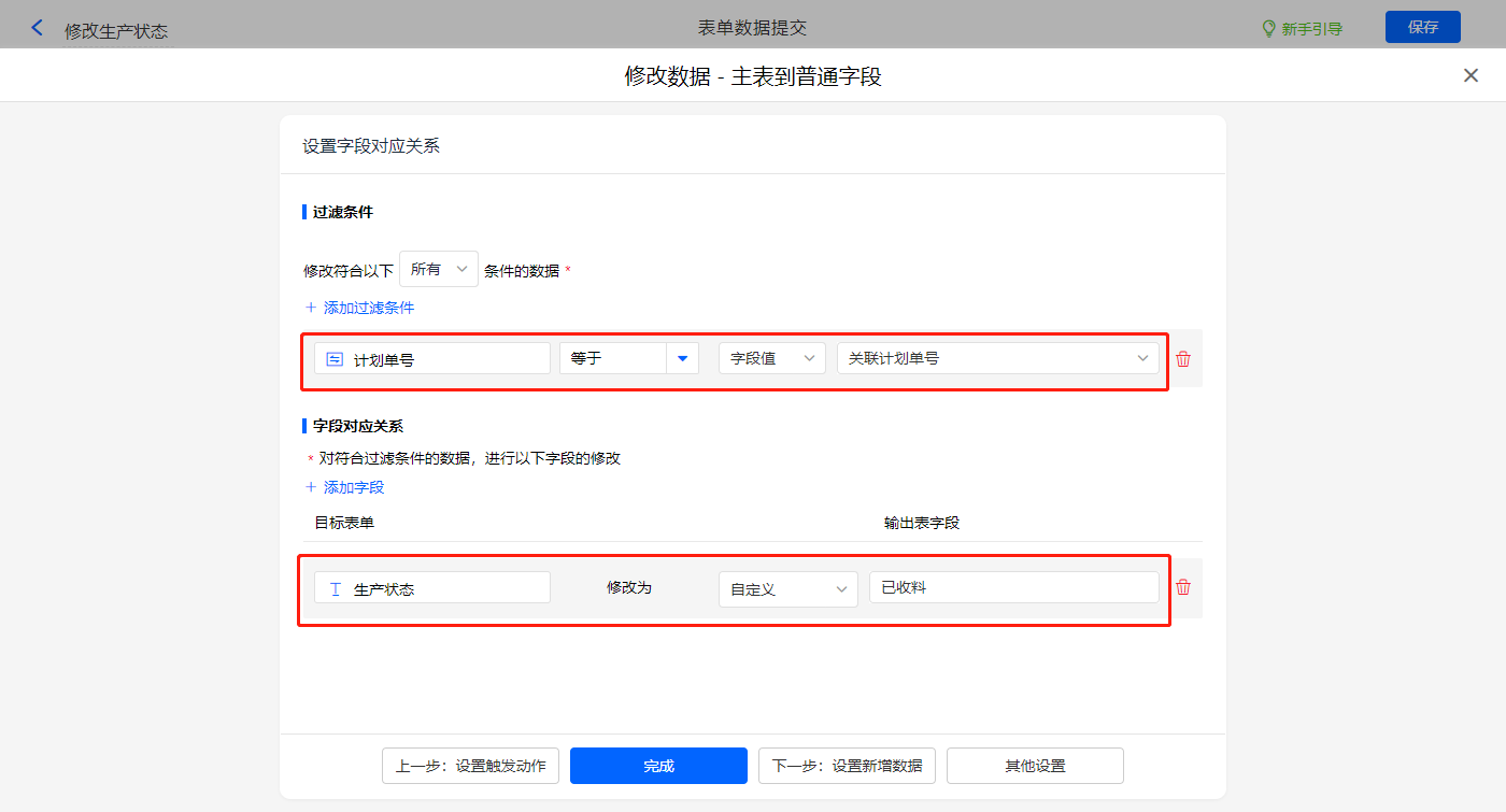 名称为修改生产状态,新增修改数据的执行动作,选择修改【生产计划】表单,选择对应过滤条件,以及需要修改的字段,设置好点击【完成】并保存该数据助手;