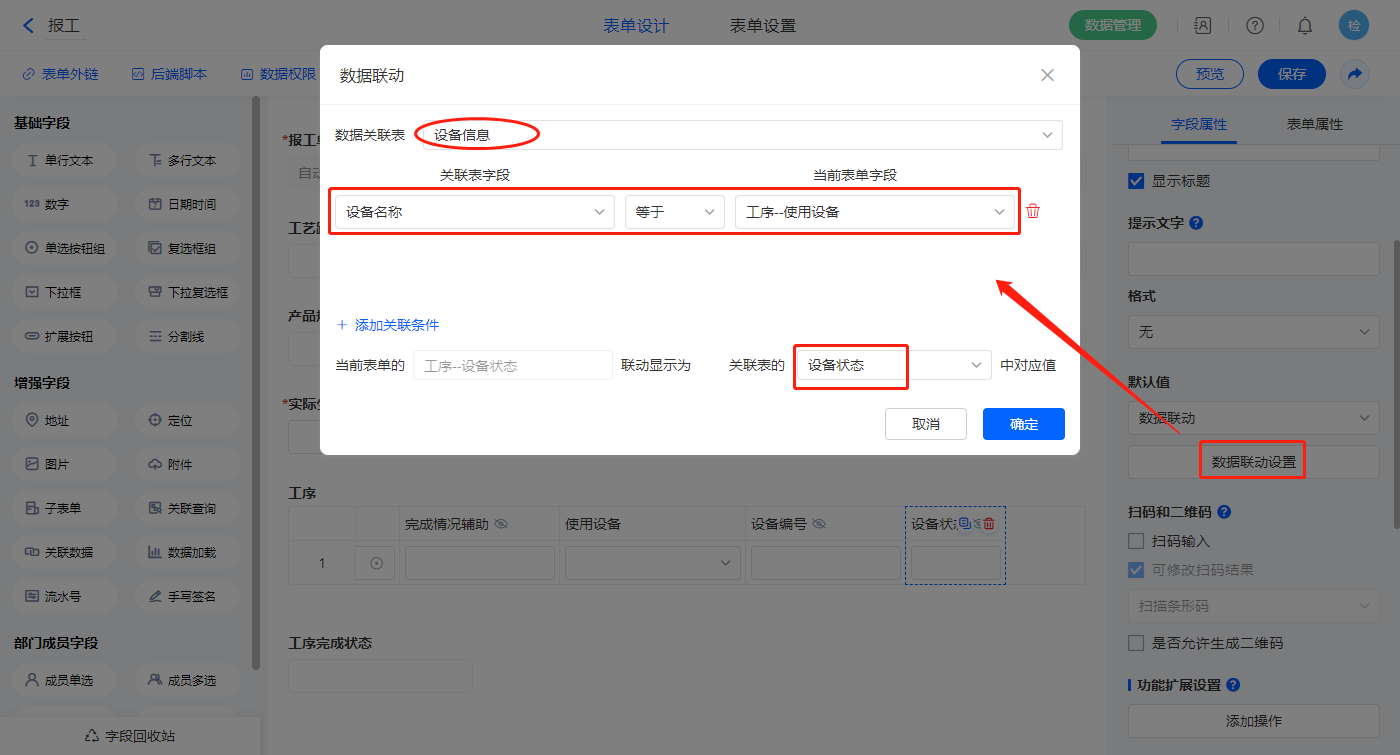 【工序.设备编号】、【工序.设备状态】字段,设置默认值为数据联动,以上字段关联表及关联条件相同,设置对应的联动字段即可;