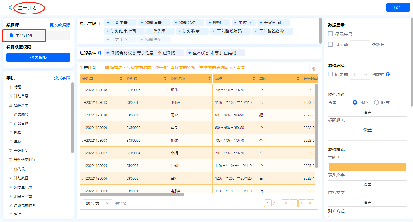 1)新增【生产中计划】报表,用基础报表【数据表】展示数据源为表单【生产计划】的数据;
