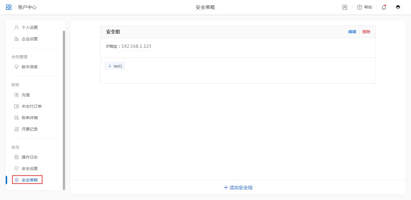 【头像】->【账户中心】->【安全策略】,并添加相应成员设置;