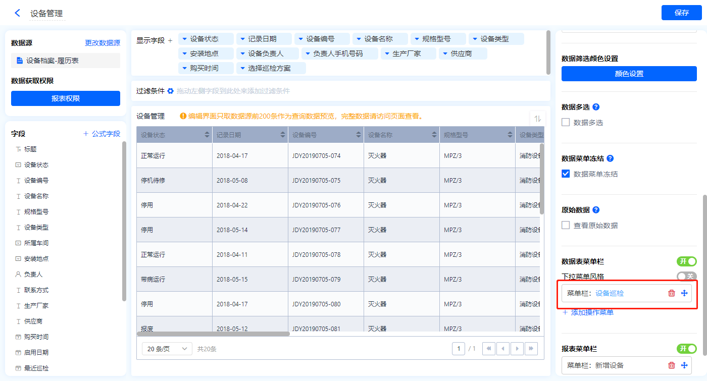 1)【选择设备】数据加载字段,数据源为【设备档案-履历表】,添加显示字段设置赋值字段,触发公式为【设备编号】字段,设置完成点击保存;
