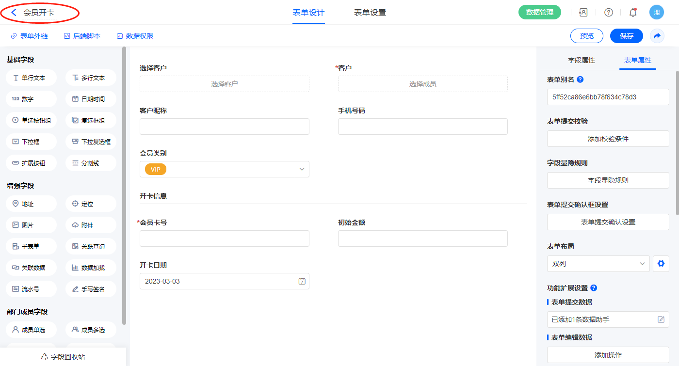 【会员开卡】的菜单栏,操作模式设置为弹出表单【会员开卡】;