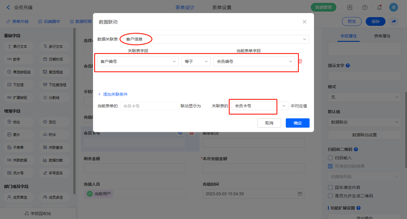 2)【会员卡号】字段,设置默认值为数据联动,设置联动条件及联动字段;