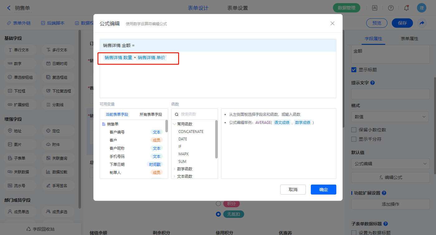 3)【销售详情.金额】字段,设置默认值为公式编辑,如图设置公式;