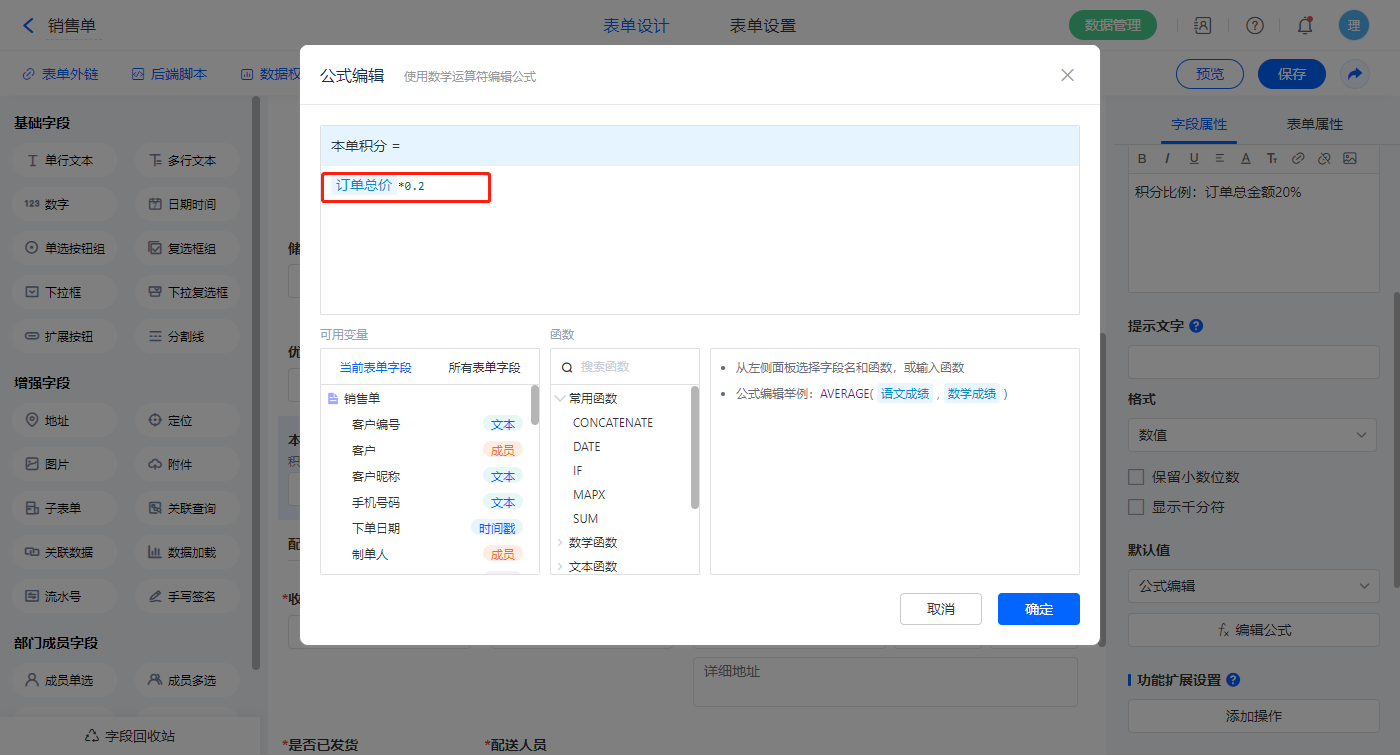 【本单积分】字段,设置默认值为公式编辑,如图设置公式;