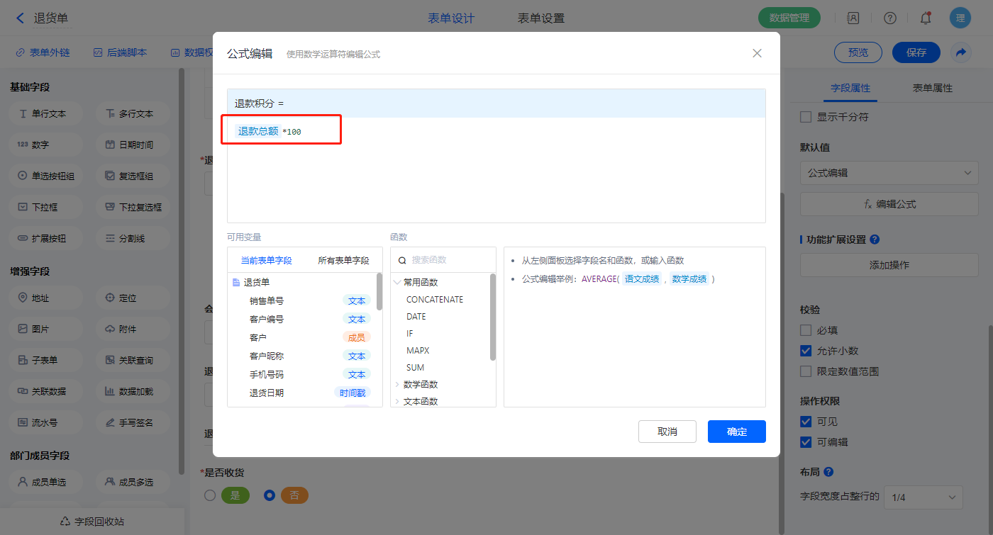 【退款积分】字段,设置默认值为公式编辑,如图设置公式;