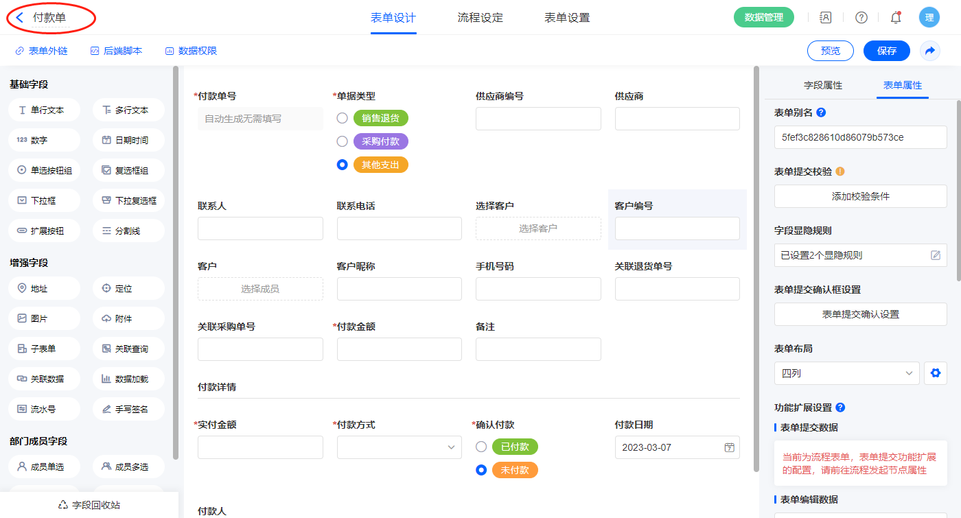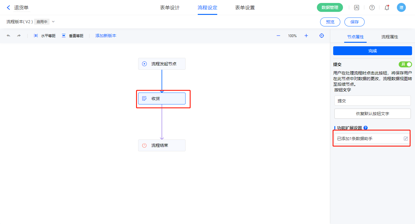 5)该表单为流程表单,设置好流程陈节点,收货节点提交设置一条数据助手,名称为付款流程;
