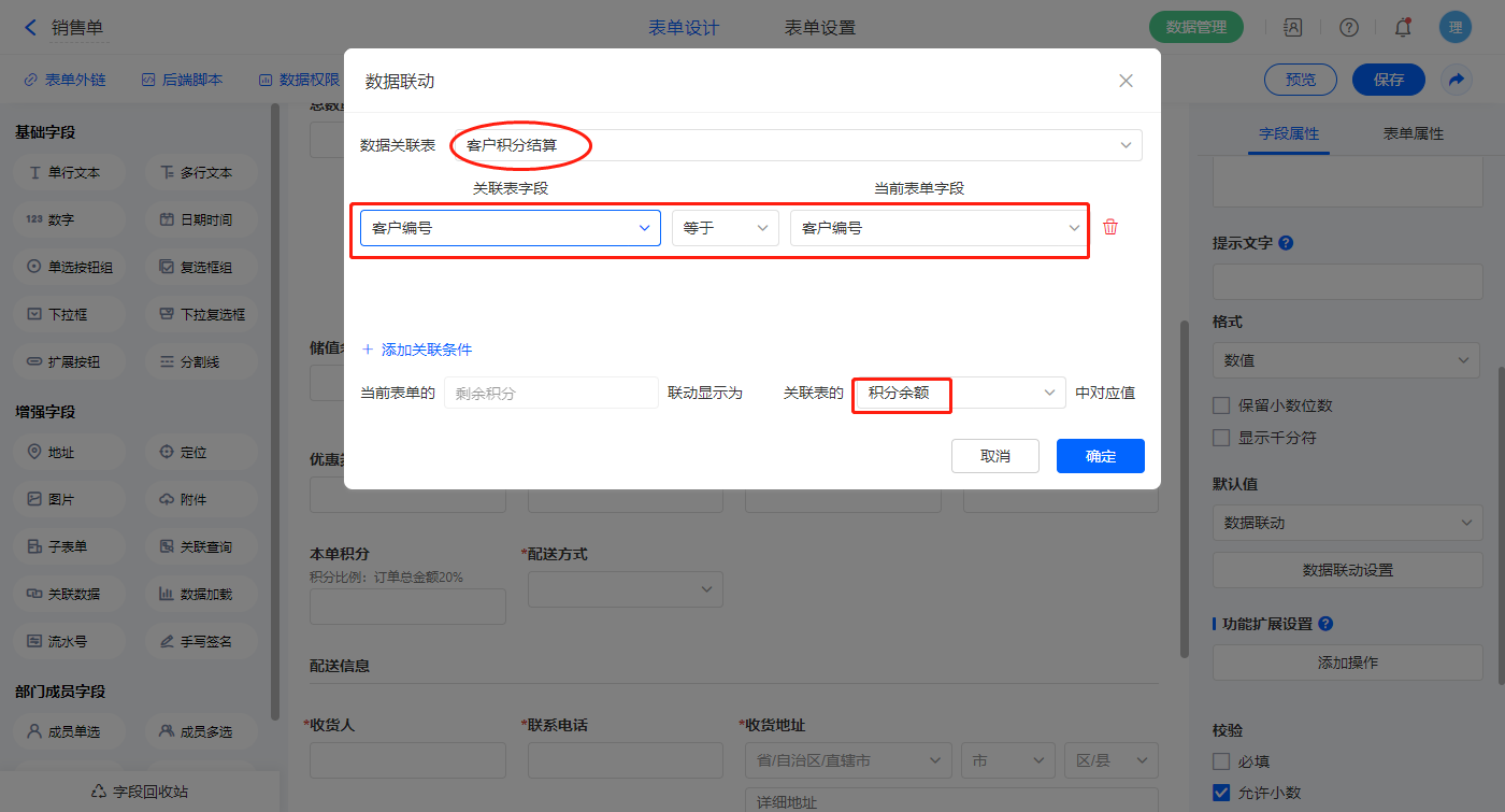 【剩余积分】字段,设置默认值为数据联动,设置联动条件及联动字段;