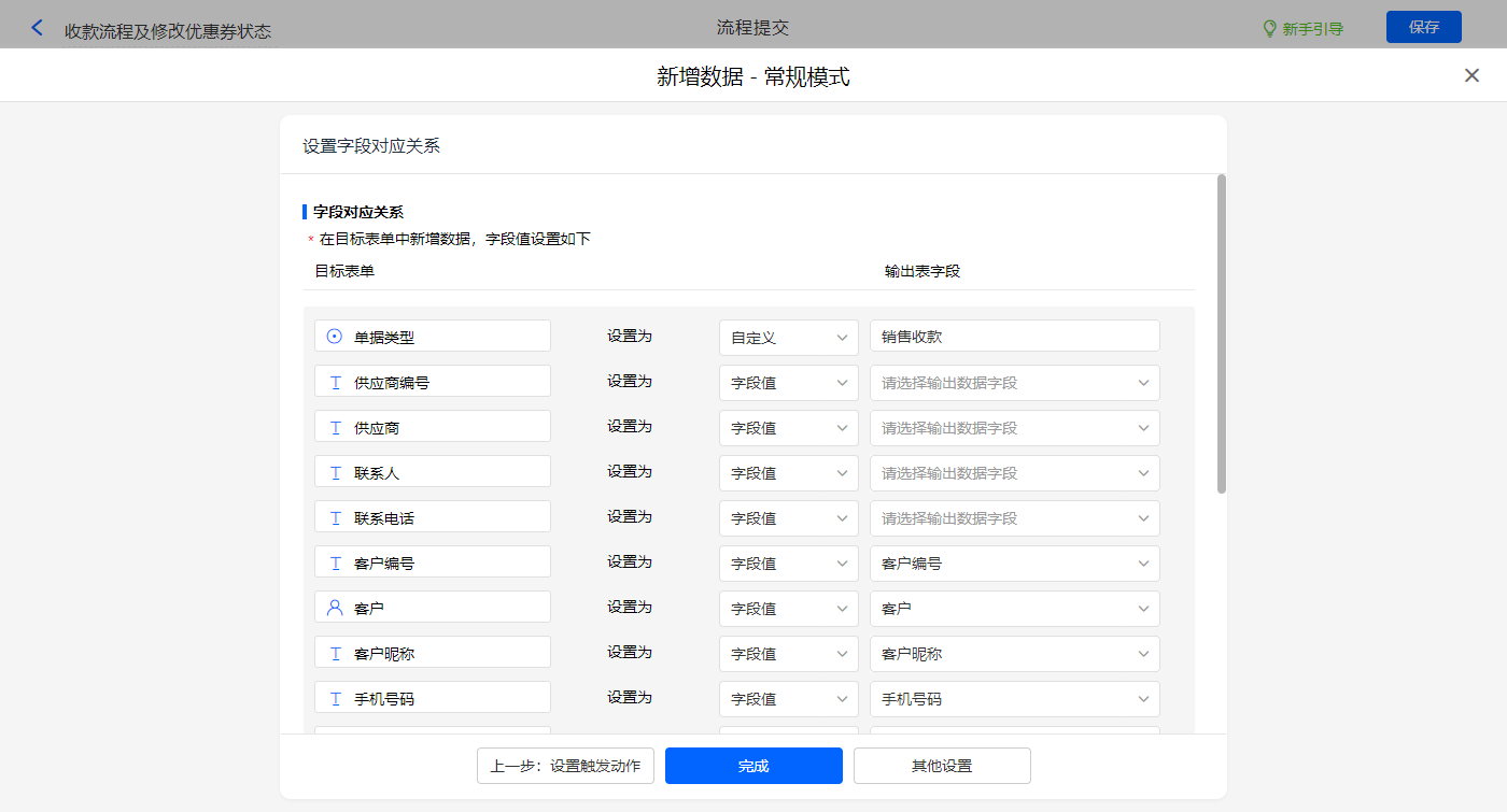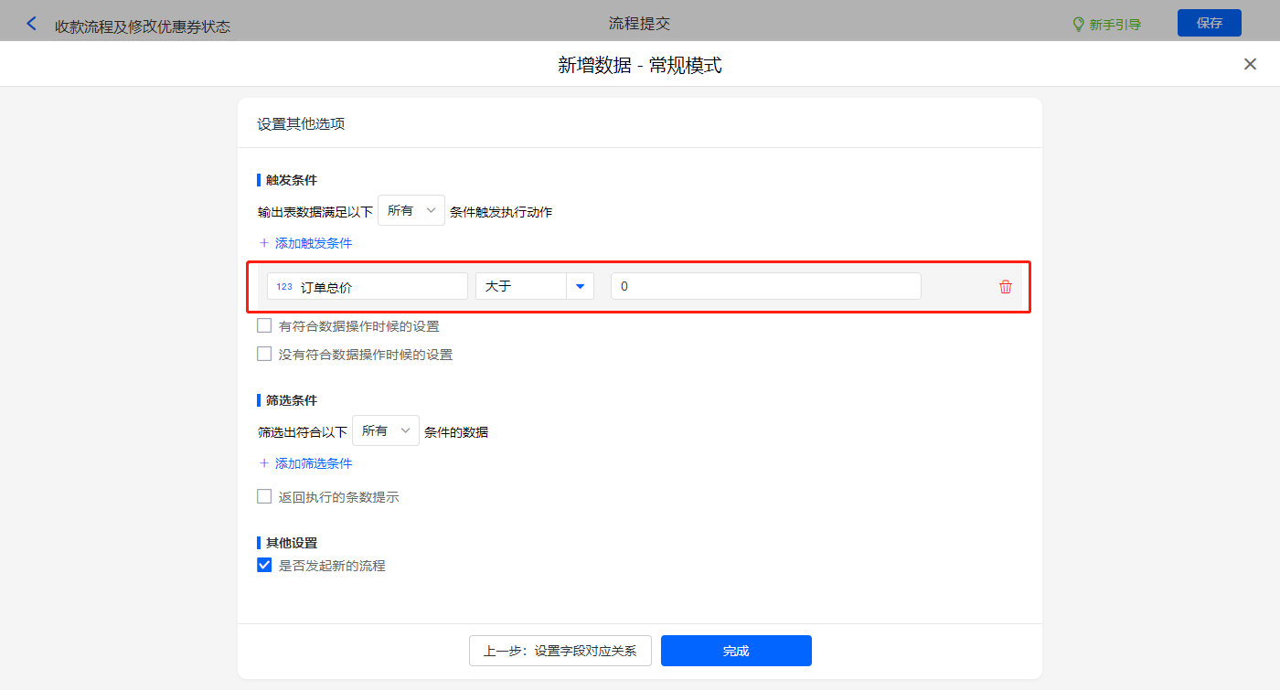 其他设置触发条件为【金额退回方式】等于无抵扣,设置好点击【完成】并保存该数据助手;