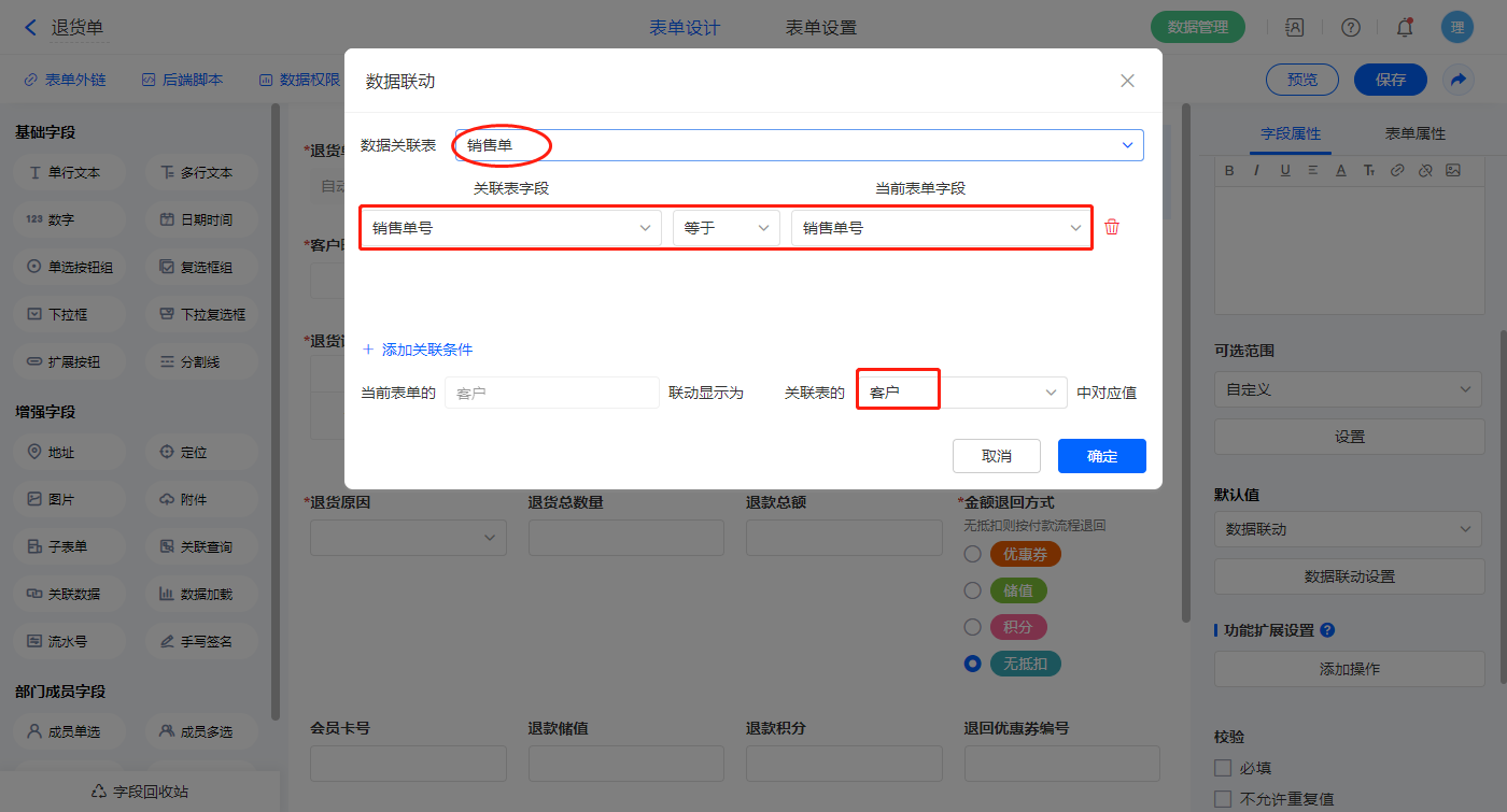 【客户】字段,设置默认值为数据联动,设置联动条件及联动字段;
