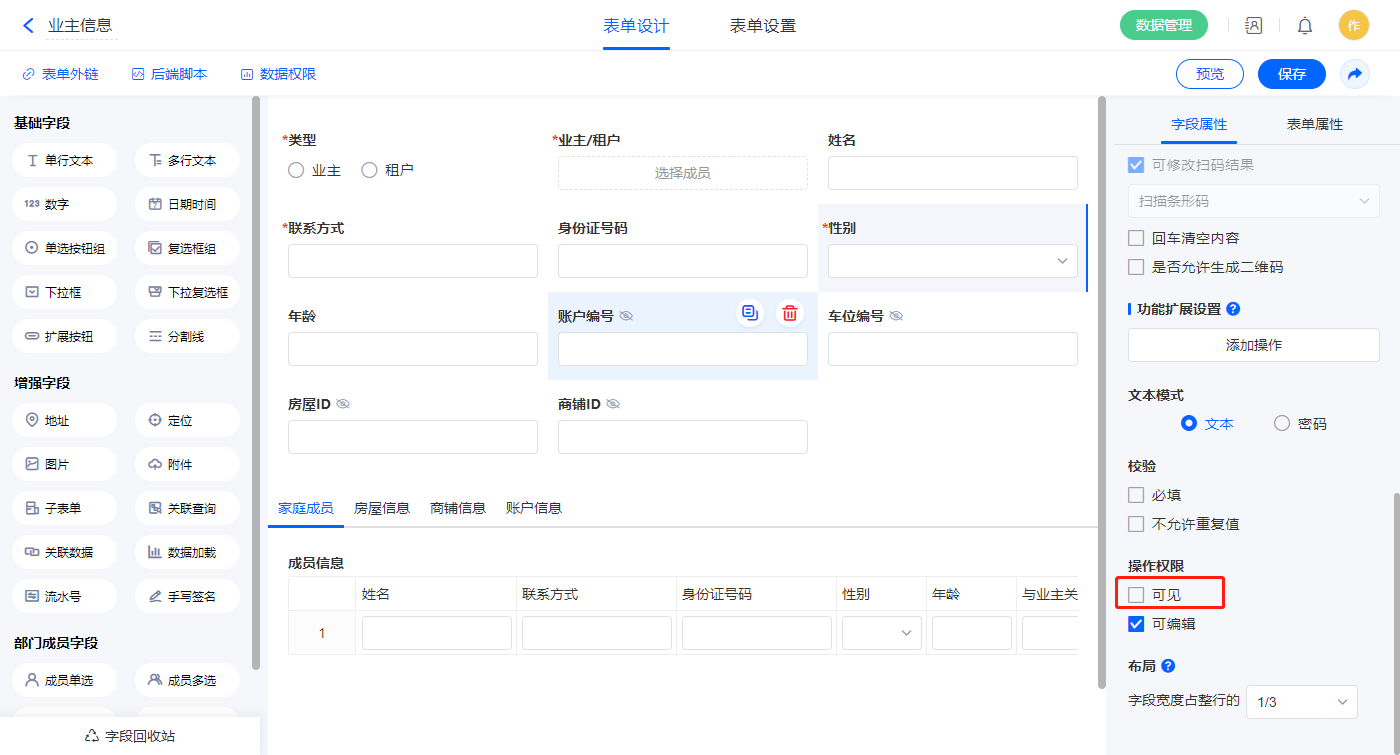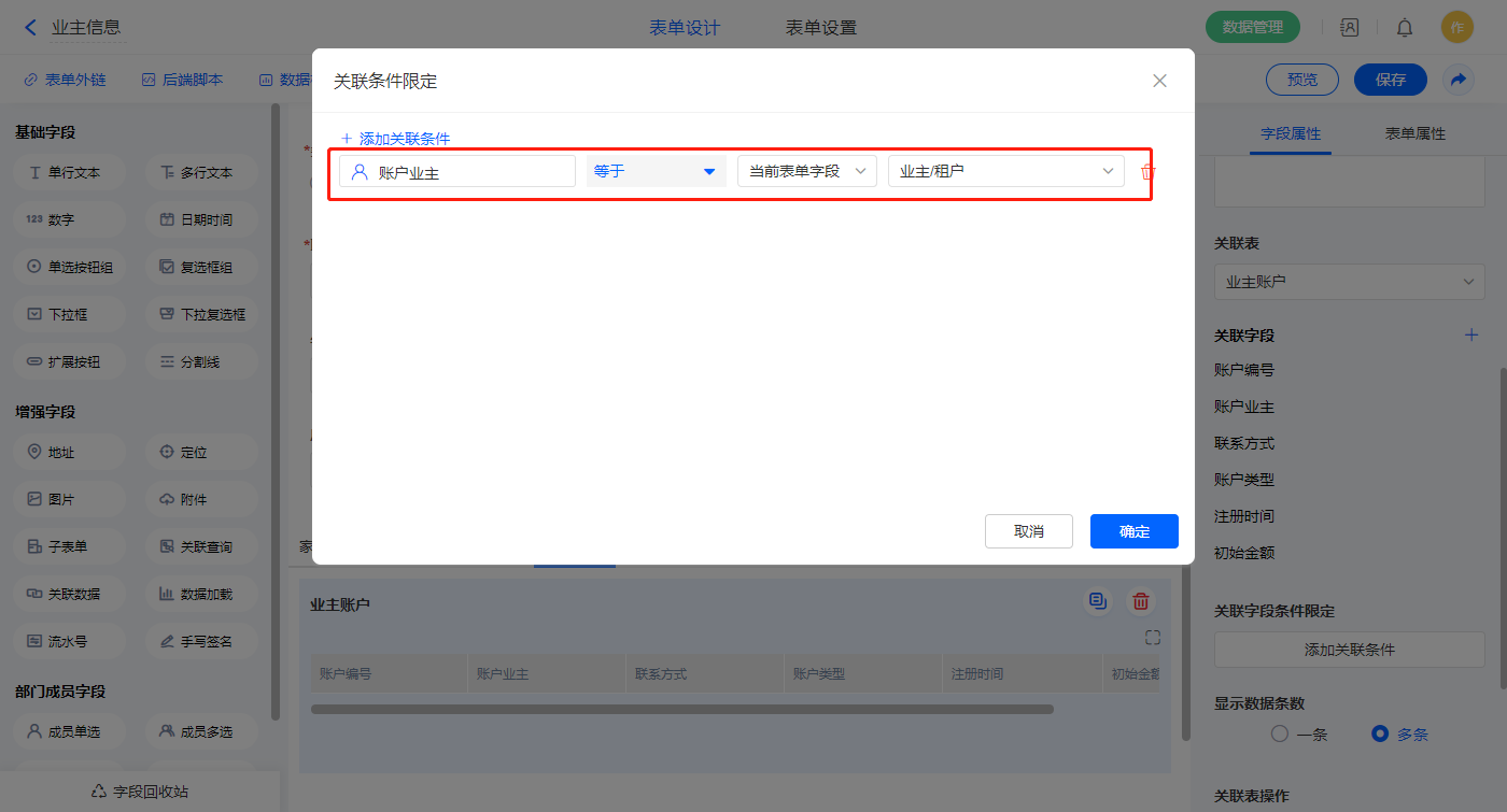 2.3、表单【业主账户】字段及表单属性设置