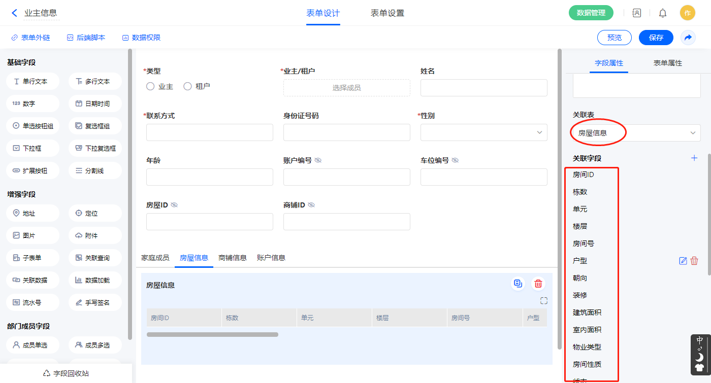 | 房间号 | 单行文本 | 业主/租方信息 | 关联查询 |