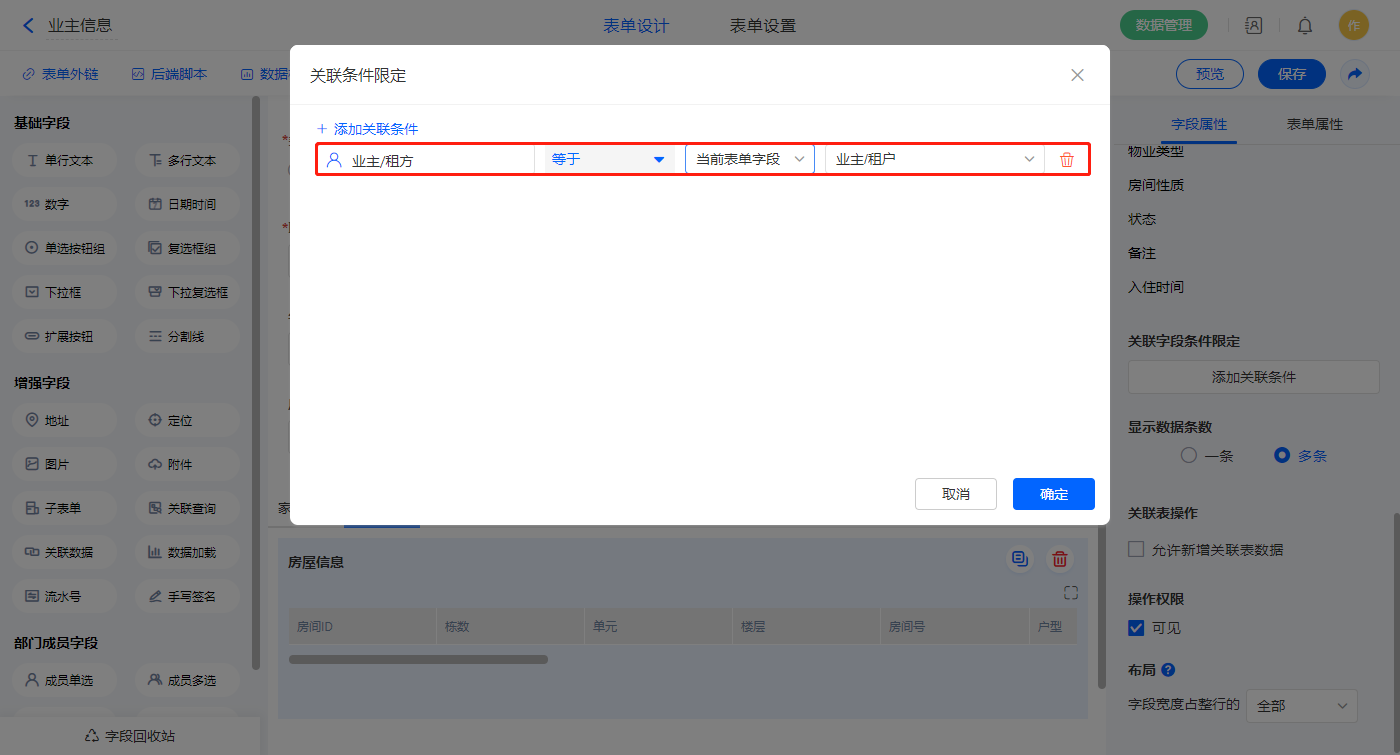 设置关联条件,【业主/租户】字段作为关联条件;