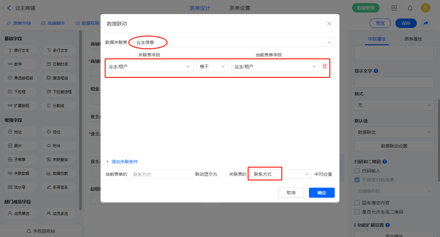 2)【联系方式】字段,设置默认值为数据联动,设置联动条件及联动字段;