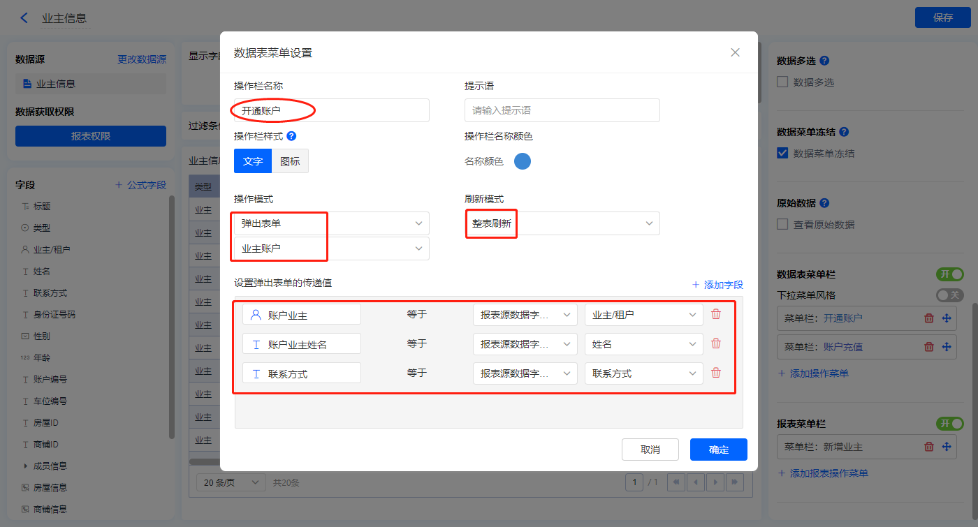 【开通账户】的菜单栏,操作模式设置为弹出表单【业主账户】;