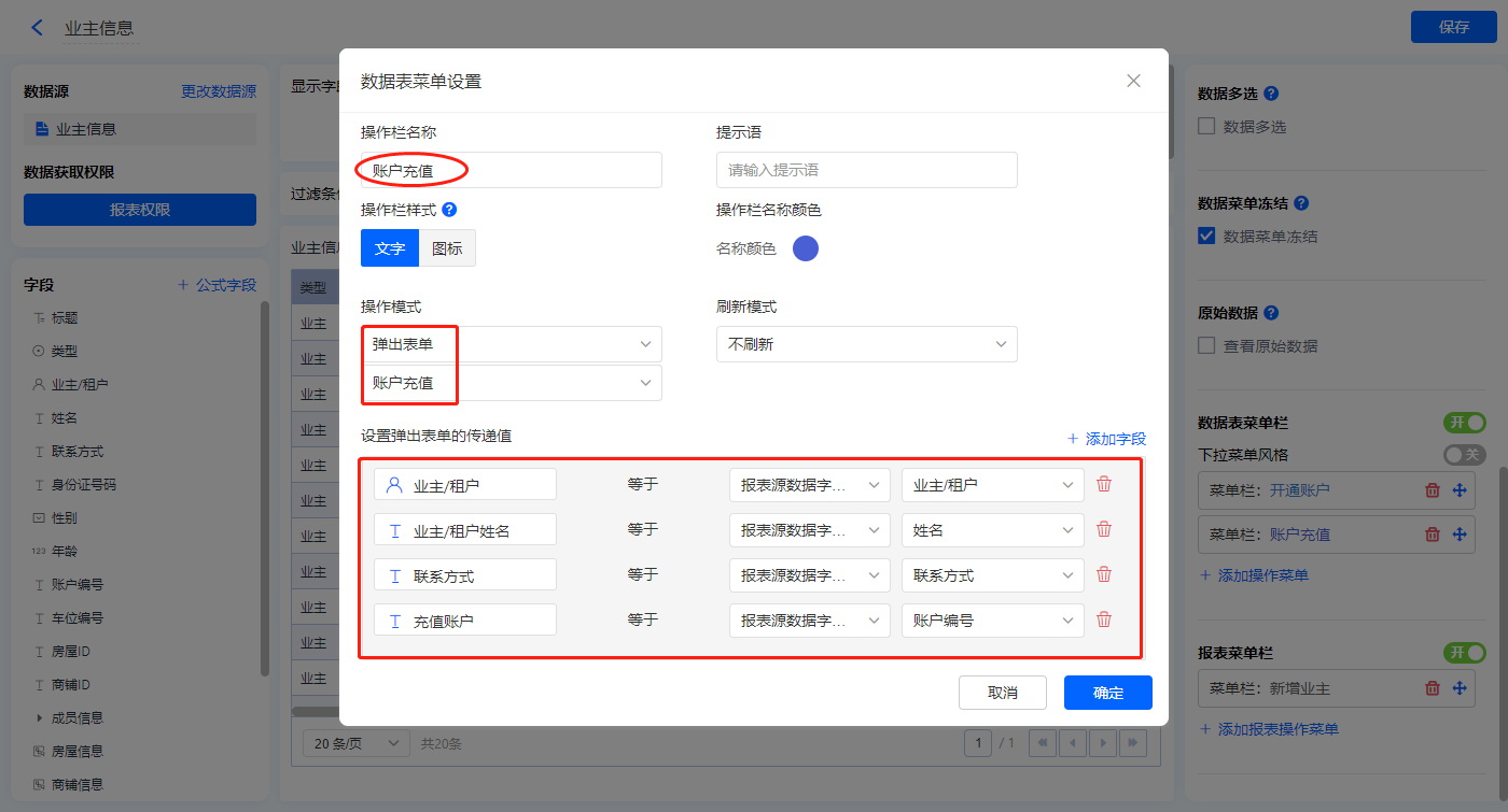 【账户充值】的菜单栏,操作模式设置为弹出表单【账户充值】;