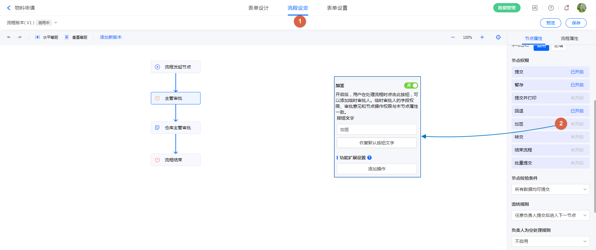 进入流程设置,选择需要支持加签的流程节点,在节点的「更多属性」设置中,找到「加签」操作,开启加签。如下图所示: