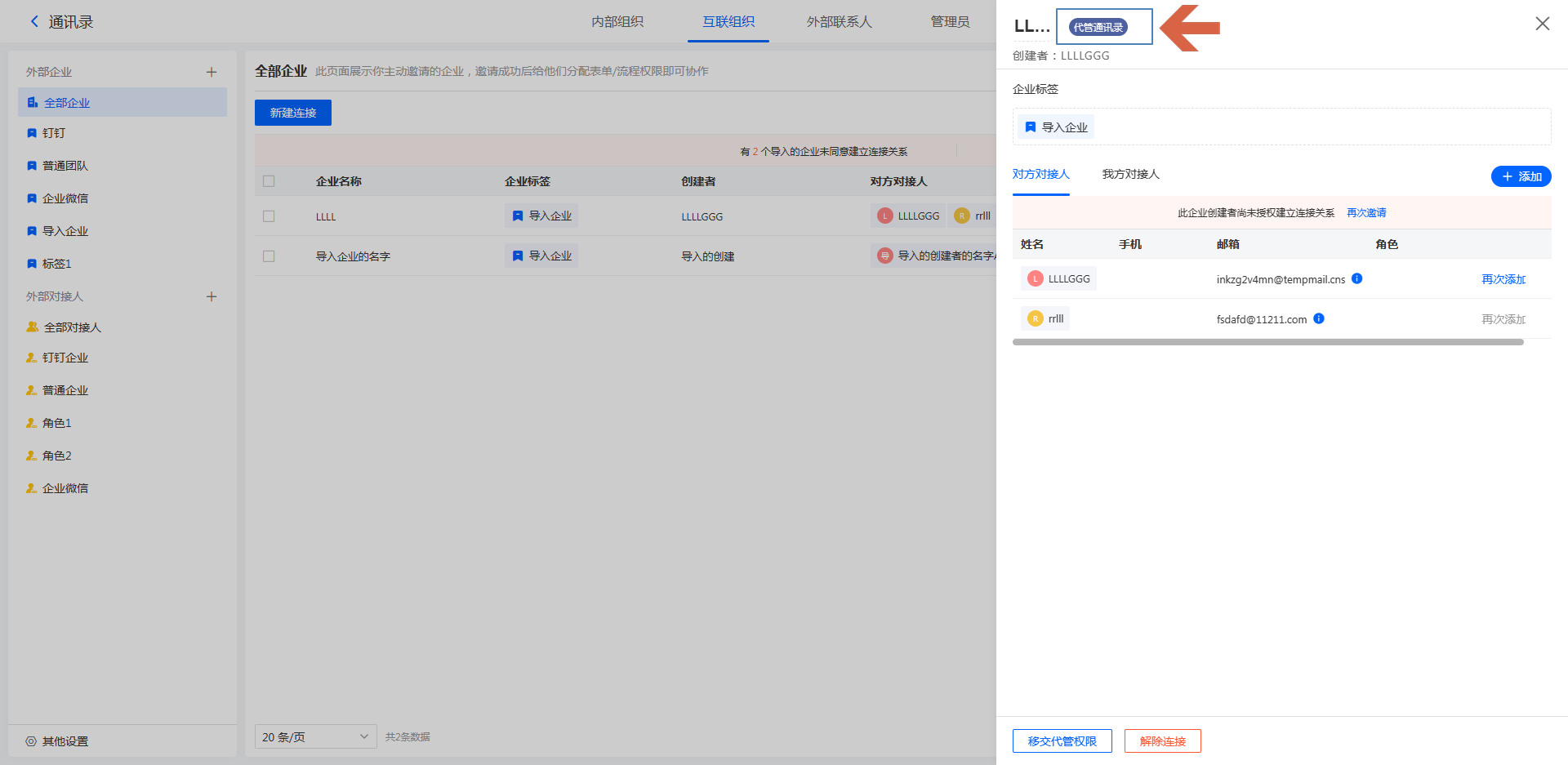 拥有代管权限的企业,可以管理代管企业的通讯录,支持管理内部组织和外部联系人。
