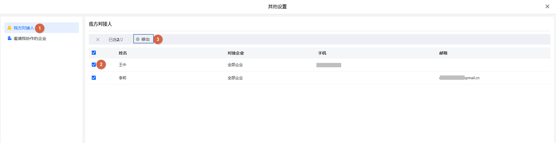当对接人发生岗位或其他变动时,需要移除对接人。