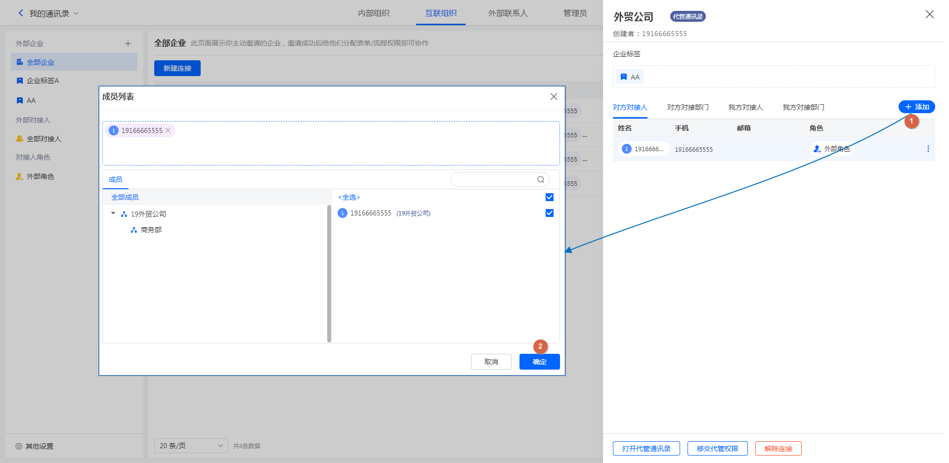 注意:只有内部成员可以设置为对接人,外部联系人不可设置为对接人;即外部联系人不参与企业互联的任何业务。