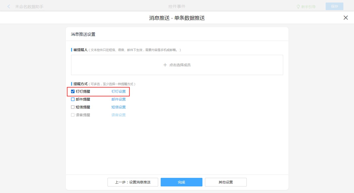 【普通表单设计】-【表单设置】-【消息推送】-【新建消息推送】-【钉钉提醒,钉钉设置】