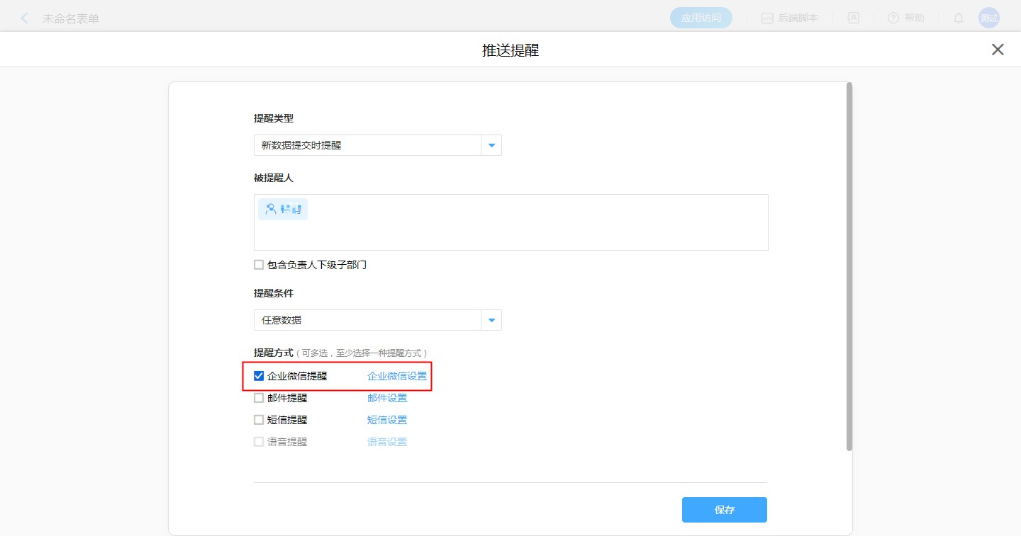 【普通表单设计】-【表单设置】-【消息推送】-【新建消息推送】-【企业微信提醒,企业微信设置】