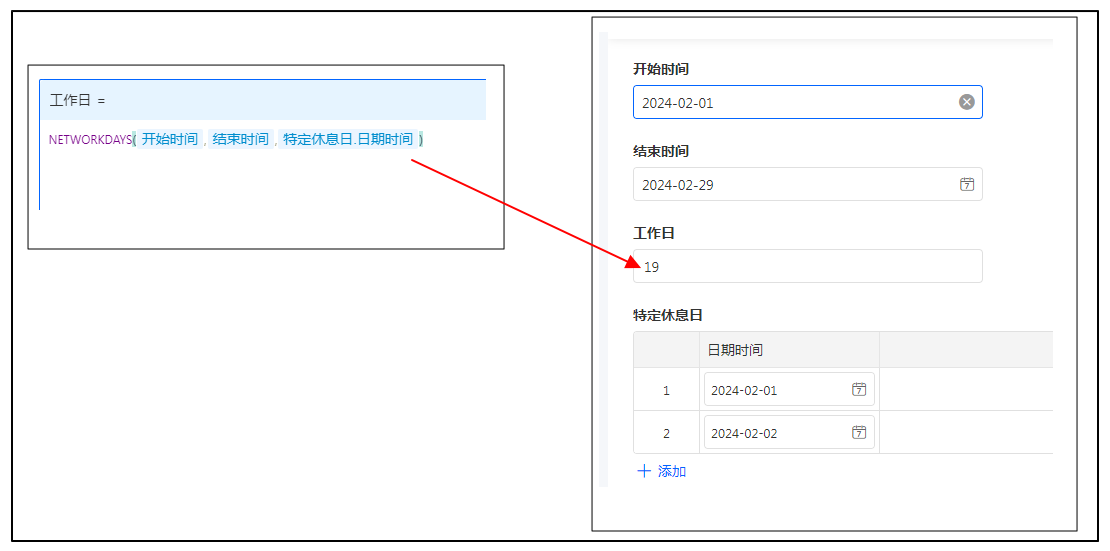 如,计算某员工 2 月外包工资时,需将 2024 年 2 月 1日和 2024 年 2 月 2 日制定为假期,则设置公式为NETWORKDAYS(开始时间,结束时间,特定休息日.日期时间),即可根据开始、结束时间计算出对应的工作天数和工资。