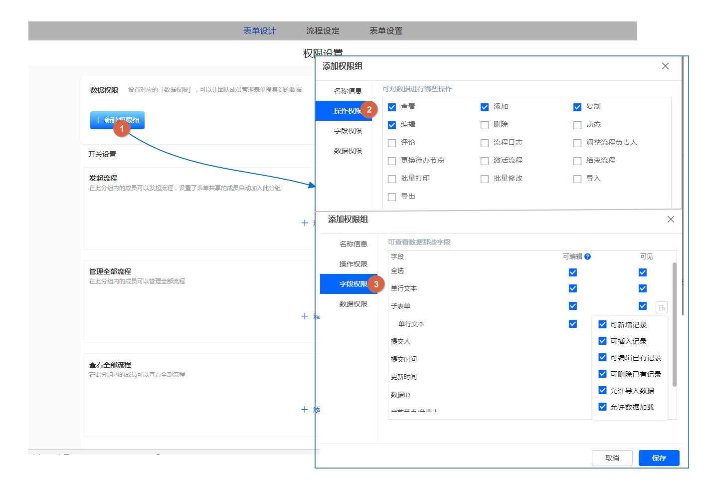 设定【自定义权限组】的「操作权限」、「字段权限」和「子表单操作权限」。