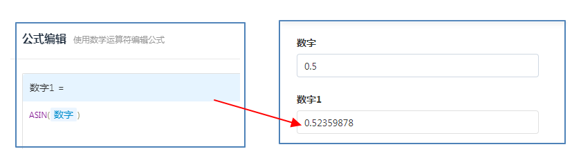 如计算ASIN(0.5)的值,返回 0.52359878。