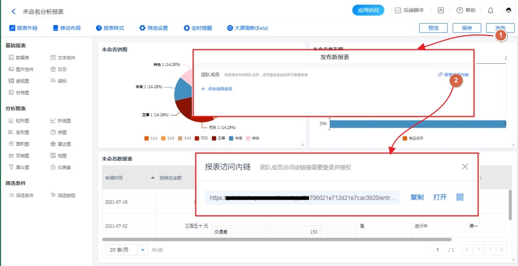 【管理应用】-【编辑报表】-【发布】,点击【报表访问内链】即可获取。