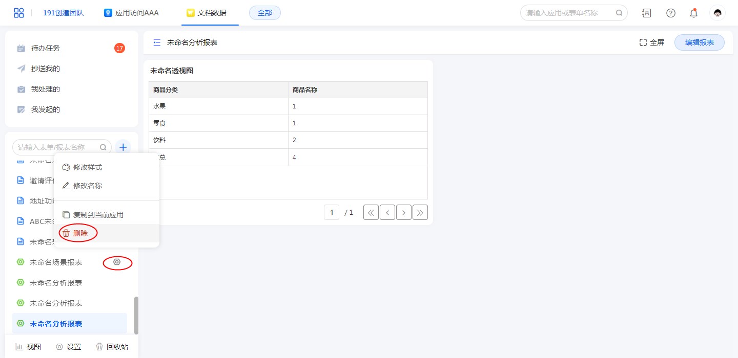 【管理应用】-【表单/报表列表下选择报表】,点击报表右侧的设置图标下的【删除】,即可删除报表,删除的报表会暂时存在表单回收站。