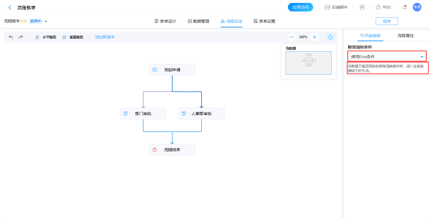 数据流转条件就是两个节点之间的连线规则,操作方法:在两个节点之间建立连线,并设置连线的流转条件。