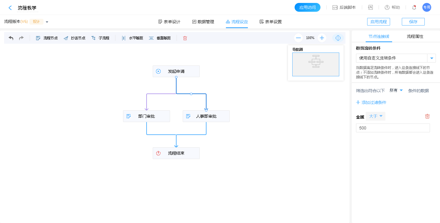 按照这个设定,我们就完成了流程的条件流转,满足金额小于500元的走部门审批环节,大于500元的走人事部审批环节。