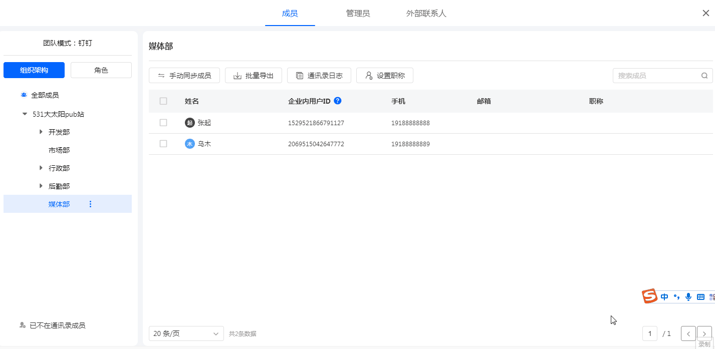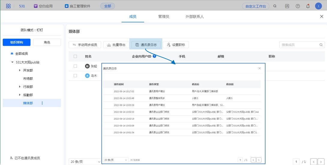 在钉钉管理后台操作组织架构及成员信息时,人员同步至通讯录再同步到表单通讯录中。
