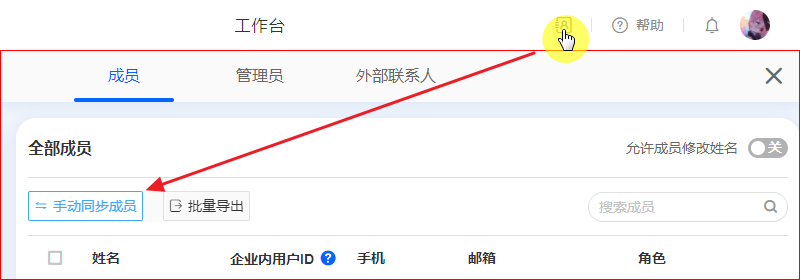 当团队组织架构或成员信息发生变化后,点击手动同步成员按钮进行组织架构的同步操作。