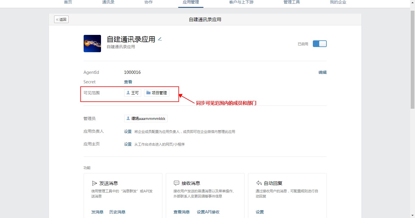 一码通应用和辅助通讯录同步的应用设置可见范围。