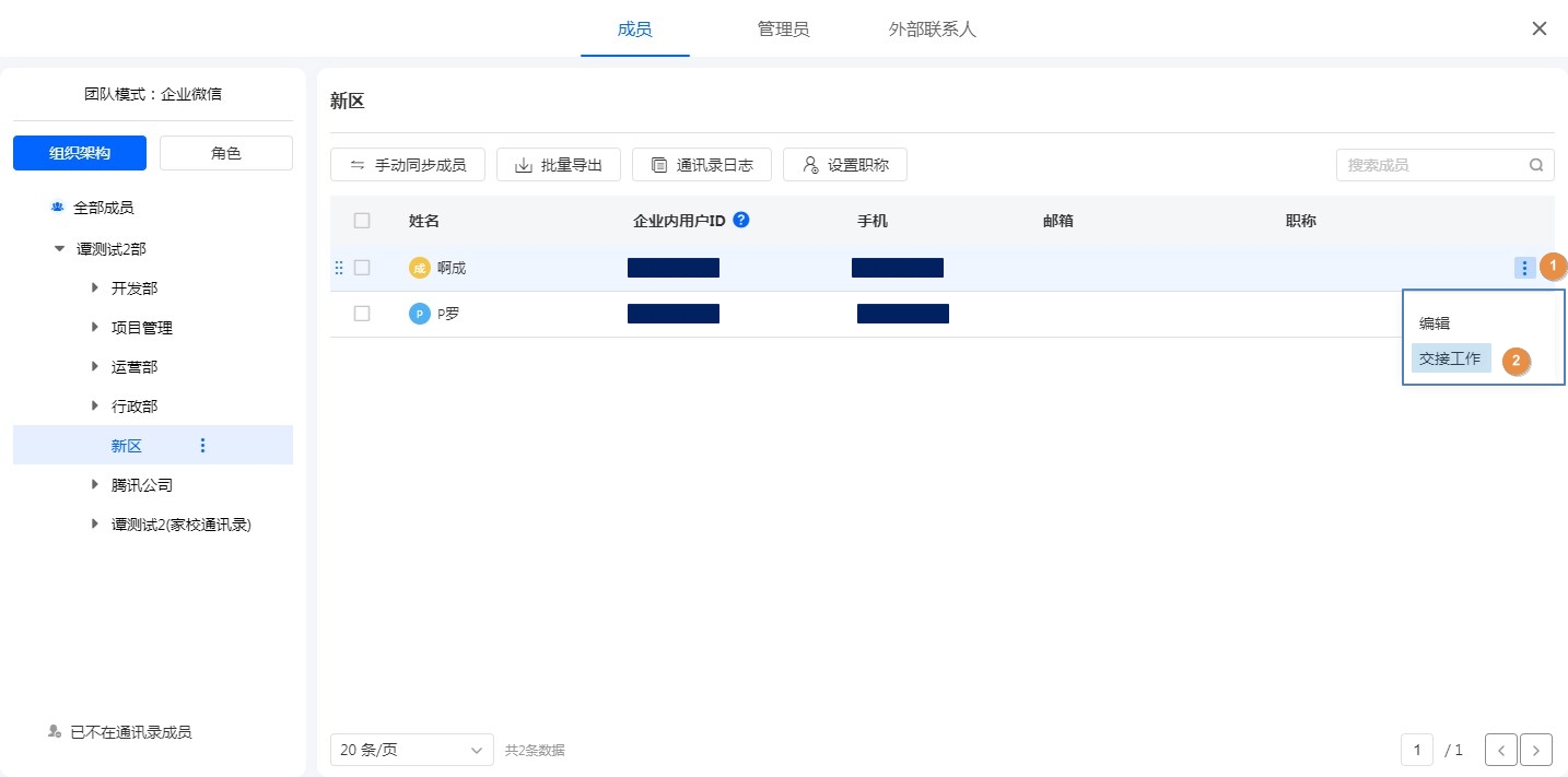 企业成员离职后,在企业微信通讯录操作成员离职。自动同步或者手动同步后,即可在「离职成员」界面看到已经离职的成员信息及其负责的工作并进行交接。