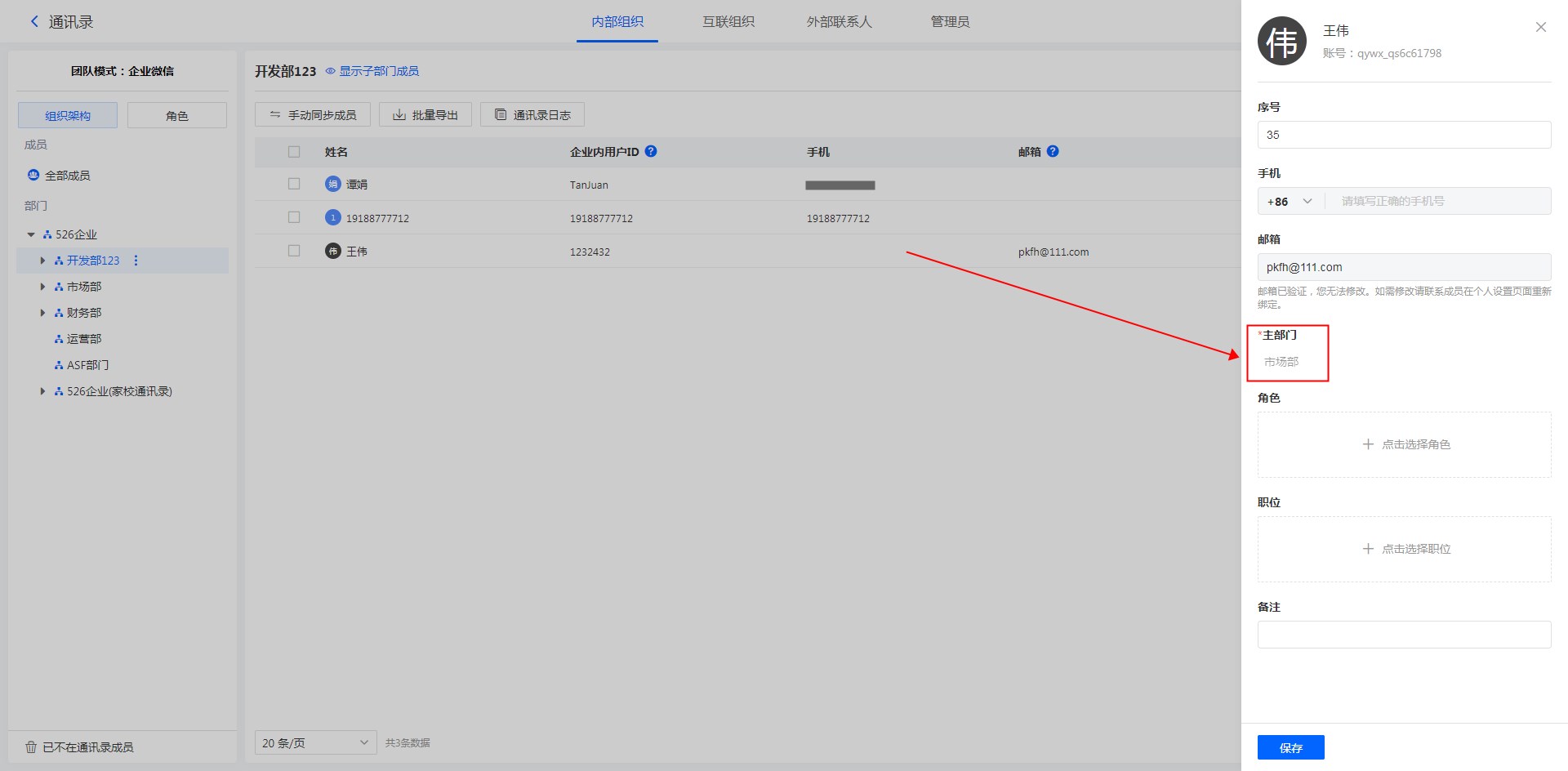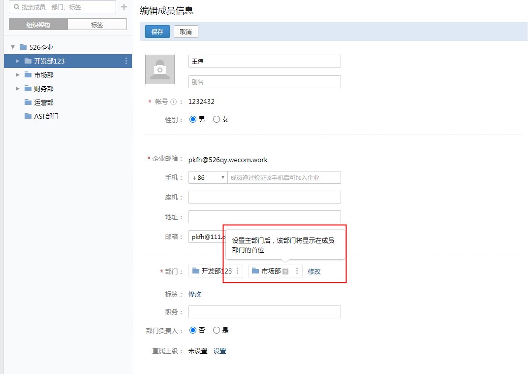 企业微信通讯录中成员主部门信息支持同步。